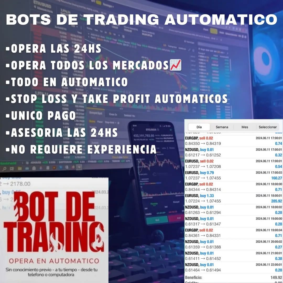 Es un bot de trading pasivo que opera en el mercado financiero (forex, criptomonedas, índices). Analiza el mercado usando 3 confirmaciones de entrada y realiza operaciones de mediano plazo con un enfoque conservador. Cada operación tiene configurado su stop loss ytake profit desde el inicio.